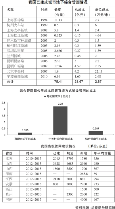 华泰证券近日发布的《城市综合管廊:从“地下”到“云端”》报告称,与国外相比,我国城市地下综合管廊起步晚、基础差、推进慢,根据文献资料,全国大约有70%的城市地下管线没有基础性城建档案资料,加上归属各部门的管线档案互不相通,除了马路经常被开挖、工程延期外,也屡屡造成建设过程中挖断管线的事故。建设城市地下综合管廊的需求已经变得十分急迫。