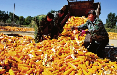 农业部农情调度显示,截至10月19日,全国秋粮已收获约76%。图为22日甘肃省酒泉市果园沟村村民晾晒丰收的玉米。