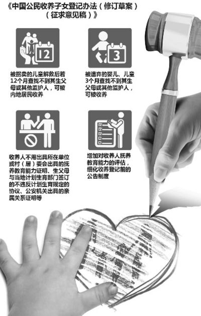三是细化收养登记前的公告制度。征求意见稿规定,收养登记机关应当在报纸和国务院民政部门指定的网站上发布公告,公布经过技术处理的被收养人的照片、生理特征、被遗弃或者被解救的地点等信息。