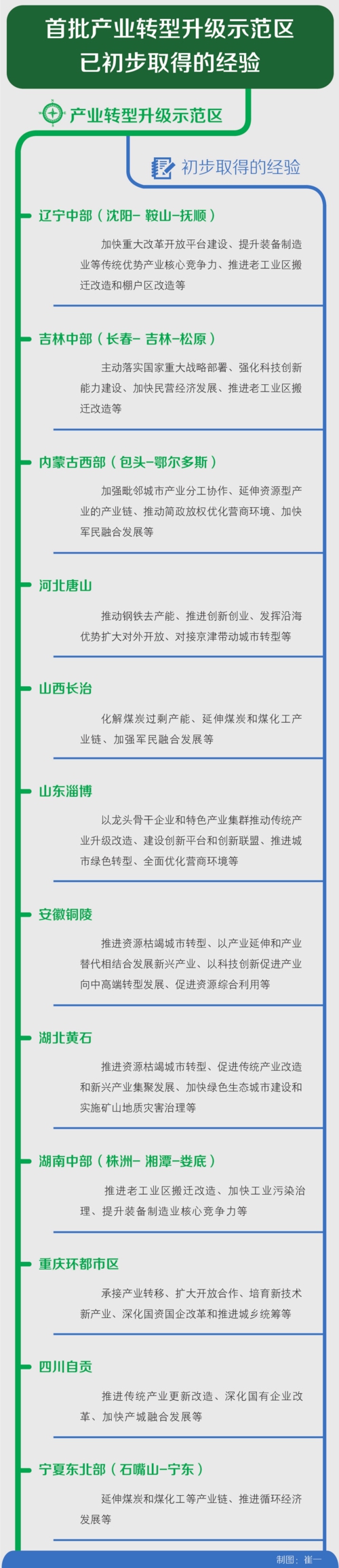 《中共中央国务院关于全面振兴东北地区等老工业基地的若干意见》明确要求,“设立老工业基地产业转型升级示范区和示范园区,促进产业向高端化、集聚化、智能化升级”。国家“十三五”规划《纲要》明确要求,“支持在老工业城市建设产业转型示范区和示范园区”。按照党中央、国务院的决策部署,去年下半年,国家发展改革委会同科技部、工业和信息化部、国土资源部、国家开发银行联合印发了《关于支持老工业城市和资源型城市产业转型升级的实施意见》和《老工业城市和资源型城市产业转型升级示范区设立管理办法》,明确在纳入《全国老工业基地调整改造规划》和《全国资源型城市可持续发展规划》范围的地市级及以上城市,支持建设一批产业转型升级示范区,并明确了示范区的设立程序和要求。去年11月,国务院办公厅印发《关于对真抓实干成效明显地方加大激励支持力度的通知》,也明确要求对老工业基地调整改造力度较大、真抓实干成效明显的地市,给予通报表彰,并优先支持这些城市建设产业转型升级示范区。
