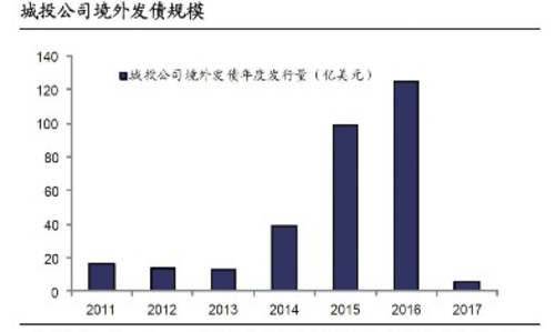 近两年城投公司海外发债悄然成风。从2015年开始,城投公司赴海外发债日渐增多,2015年共有29支城投债在海外发行,融资规模接近100亿美元,比2014年增长2.5倍还多;而2016年海外城投债累计发行增至47支,融资125亿美元,较2015年增长26%。