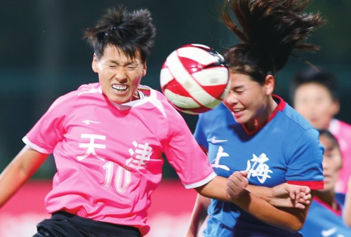 在日前结束的第十三届全运会足球项目女子成年组决赛中,上海队以5:1战胜天津队,获得冠军。图为两队球员在比赛中争顶。新华社