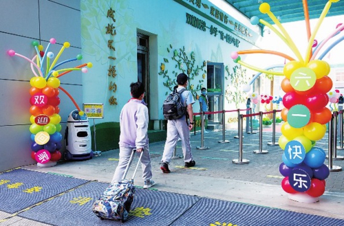 6月1日,北京的高一高二、初一初二以及小学六年级的40多万学生迎来本学期开学。图为海淀区双榆树中心小学为避免人员扎堆聚集,在校门口设置了安全通道,并充分考虑了当天“六一”儿童节的节日氛围。
