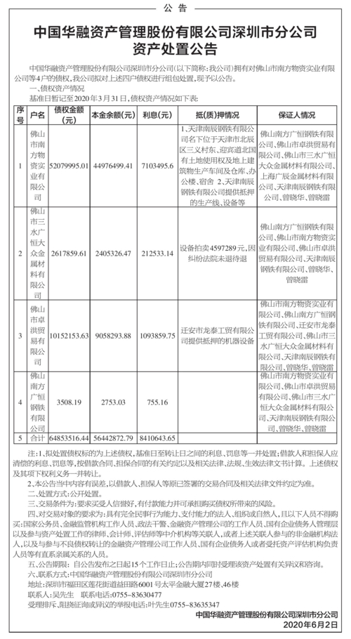 中国华融资产管理股份有限公司深圳市分公司资产处置公告