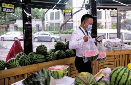 午饭和短暂休息后,是轻松的“午会”时间,李勇会带着大家做些小游戏或者唱唱歌,提振一下大家的精神。下午,当大家工作一段时间后,李勇照例从附近买回西瓜,并让卖家切好,带回来和同事们一起分享。
