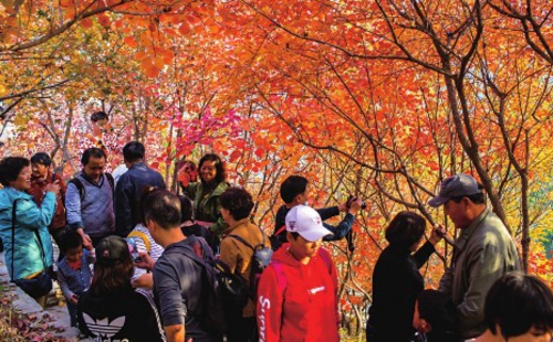 如今,北京观赏红叶的地方早已不限于以香山为代表的西山等地。近些年,一大批森林公园、郊野公园相继建成,它们在美化了城市环境的同时,也为市民们提供了更多的秋游赏红的绝佳景点。实际上,从2002年起,北京就开始推进彩叶造林工程,一年一度的延庆八达岭长城红叶节也是从这一年开始启动的。目前,八达岭长城两侧共分布着3000余亩红叶林,20余万株彩叶树,在漫山遍野的各种红叶、彩叶映衬下,蜿蜒曲折的长城更显雄浑壮丽。