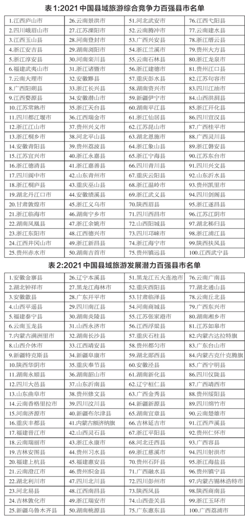 11月2日,竞争力智库、中国经济导报社和北京中新城市规划设计研究院等机构在北京联合发布《中国县域旅游竞争力报告2021》。《报告》对2020年我国县域旅游发展情况作了全面梳理,完成了第四届全国县域旅游竞争力评价工作,发布了“2021中国县域旅游综合竞争力百强县市”和“2021中国县域旅游发展潜力百强县市”(简称“2021中国旅游百强县市”和“2021中国旅游潜力百强县市”)。