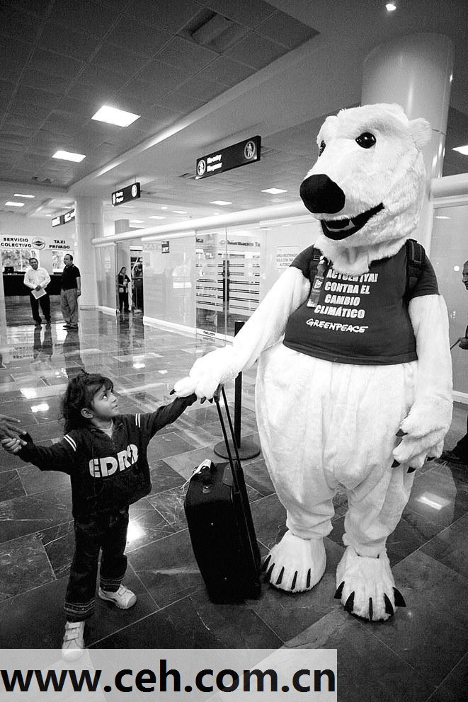 |  | | | 人祸·熊惑 6月5日是世界环境日。联合国环境规划署确定今年世界环境日的主题是“你的星球需要你,联合起来应对气候变化”。为了积极呼应这个主题,并根据中国环境保护的实际情况,中国确定今年环境日的主题是“减少污染、行动起来”。图为今年6月4日的墨西哥坎昆国际机场,3名绿色和平组织成员装扮成北极熊呼吁社会关注全球气候变暖。 CFP/供图 |