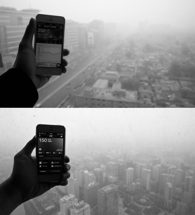 |  | | | 上图:2013年4月23日,在北京宣武门一高层建筑,手机应用程序显示当日上午11点更新的北京空气污染指数(API)为250,空气质量状况为中度污染。