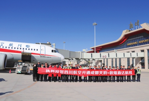 |  | | 前不久,甘肃敦煌莫高国际机场全面启动夏秋航季航班计划,由四川航空公司执飞的成都至敦煌往返直达航线正式通航。图为首航航班机组人员与机场工作人员在甘肃敦煌莫高国际机场合影。新华社 |