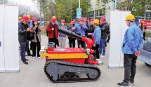 海伦哲公司副董事长兼总经理尹亚平向记者介绍消防机器人。