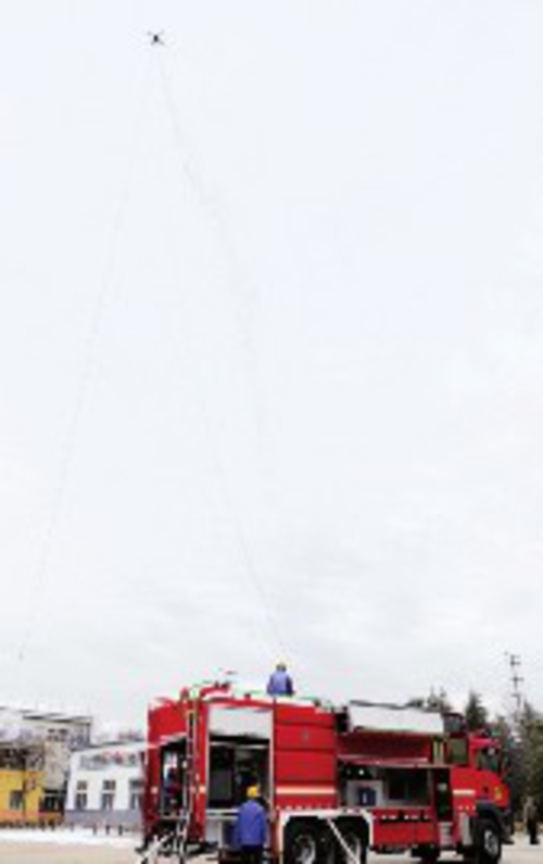 高空系留无人机灭火消防车演示。