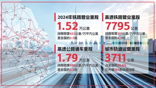 在规划图中,红色线条尤为醒目,它们代表"十四五"时期规划建设铁路线路,将既有干线串线成网,连接了上海、南京、杭州、合肥、宁波等核心城市,以及一些新兴的城市节点。沿杭州湾北岸规划的新通道直接串联上海南部与宁波北部,形成一条平行于既有沪杭甬主轴的沿海铁路,极大提升沿海产业带的联通效率。沪苏锡嘉等核心城市间规划的多条跨省、跨区域的短连接线,如同针线般将太仓、昆山、嘉善等节点城市更紧密地"缝合"入网。从合肥、杭州等中心出发的射线向皖西、浙南等内陆腹地延伸。 近日,国家发展改革委批复新建上海至杭州高速铁路可行性研究报告。作为国家"十四五"102项重大工程项目,线路长约223.8公里,总投资约670.97亿元。与2010年开通的沪昆高铁沪杭段相比,二线方案更靠东南,且站点设置覆盖区域更广,有望带动沿线更多区域的经济发展。 规划图中的蓝色线条代表在建的铁路项目,它们是即将投入运营的"准动脉"。目前,宁淮城际铁路正全速推进,这条贯穿江苏南北的"城际快线"通车后,南京与淮安将实现"1小时直达",不仅拉近了城市距离,更将为苏皖沿线区域注入发展新动能,让人才、产业、资源流动更加顺畅。而备受瞩目的甬舟铁路更是"硬核"登场,作为国家《中长期铁路网规划(2016-2030年)》的重大项目,将首次实现高铁直达舟山群岛。其控制性工程--全长约16.2公里的金塘海底隧道与西堠门公铁两用桥,采用"桥隧结合"方式跨海,是我国首条真正意义上的海底高铁隧道。项目力争2028年建成通车,届时将结束舟山不通铁路的历史,从宁波坐高铁到舟山仅需26分钟,杭州至舟山最快只需77分钟,让长三角的"最后一块拼图"融入轨道版图。 蓝色在建铁路与红色规划建设铁路紧密衔接,叠加灰色既有铁路网络,实现新老线路协同互补,确保长三角轨道交通建设的连续性、系统性与前瞻性。 "十四五"规划《纲要》指出,加快基础设施互联互通,实现长三角地级及以上城市高铁全覆盖。 国家发展改革委综合运输研究所综合研究室主任丁金学告诉记者,"十四五"期间,长三角轨道交通建设重点和方向是以上海、南京、杭州、合肥、苏锡常、宁波等为节点,构建对外高效联通、内部有机衔接的多层次轨道交通网络,既注重强化上海、南京、杭州、合肥四大中心之间的"主动脉"连接,也侧重加密都市圈内部的"毛细血管",围绕实现上海以及南京、杭州、合肥、苏锡常、宁波等都市圈1小时通勤和中心城市间1~2小时快速联通,着力打造"轨道上的长三角"。 蓝图的推进,离不开强有力的跨区域协同机制保障。 2018年1月底,由上海牵头,沪、苏、浙、皖三省一市共同组建,长三角区域合作办公室在上海正式设立,成为长三角一体化进程中的第一个跨行政区划的常设机构。 2019年12月,中共中央、国务院印发的《长江三角洲区域一体化发展规划纲要》明确指出,到2025年,长三角一体化发展取得实质性进展。基础设施互联互通基本实现,轨道上的长三角基本建成。 2021年6月,国家发展改革委印发的《长江三角洲地区多层次轨道交通规划》提出,到2025年,长三角轨道交通总里程达到2.2万公里以上,新增里程超过8000公里,高速铁路通达地级以上城市,铁路联通全部城区常住人口20万以上的城市,轨道交通运输服务覆盖80%的城区常住人口5万以上的城镇。根据项目清单,"十四五"期间,长三角区域规划建设63个轨道交通项目,其中干线铁路24项,城际铁路9项,市域(郊)铁路30项。 长三角多层次一体化的轨道交通体系主要包括四个层级:干线铁路主要服务跨区域中长距离客货运输,加强长三角与全国铁路网的衔接联通;城际铁路重点是强化上海、南京等重点都市圈中心城市之间的高效联通;市域(郊)铁路打造0.5~1小时通勤圈;城市轨道交通主要服务于超大、特大城市中心城区。 发达完善的铁路网,已成为长三角一体化高质量发展的标志之一。截至2024年底,长三角铁路营业里程突破1.5万公里,跃居全国第一,其中高铁营业里程超7700公里,占比首次过半。2024年,长三角铁路线网密度423公里/万平方公里,是全国的2.5倍。其中,高铁线网密度217公里/万平方公里,是全国的4.3倍;城市轨道运营里程3711公里,占全国的30.6%,已开通103条轨道线路。 中国铁路上海局集团有限公司的数据显示,"十四五"期间,长三角铁路建设始终保持高位运行态势,建设投资从2021年的约900亿元,一路攀升至2024年的1423.8亿元,屡创历史新高。2025年,长三角铁路建设投资预计超1400亿元,同步推进的续建项目达25个,在建项目总投资规模超8000亿元,均位居全国铁路前列。 持续的高强度投入,正在加速将规划转化为兴业利民的现实成果。2022年9月,作为杭州亚运会"迎宾大道"的合杭高铁湖杭段与杭州西站同步投用,将杭州至湖州的旅行时间压缩至半小时,有效增强长三角核心区对浙西、皖南的辐射力。 2024年6月,"超级大环线"G8388次列车从上海站飞驰而出,在长三角21座车站划出了一个1200公里"大圈",将最密集、经济最发达的沪宁、沪杭地区,和旅游资源最丰富的浙西、皖南紧密衔接。 "轨道上的长三角"建设正在加快推进,四通八达的高铁网促进沪苏浙皖深度互联互通,长三角城市间时空距离越来越"近",中国铁路上海局集团有限公司管内各地间基本实现3小时内通达。