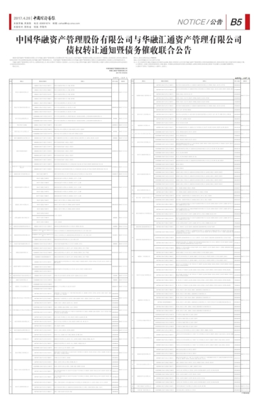 中国华融资产管理股份有限公司与华融汇通资产管理有限公司债权转让通知暨债务催收联合公告