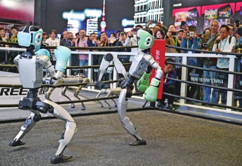 |  | | | 在第八届进博会宇树科技展台,人形机器人进行格斗表演。新华社 |